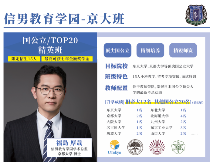 作为日本国立九州大学首家海外人才培养基地,信男教育学园每年三月与九州大学主办的NEEP,学生结业后获得的证书成为报考九州大学的有力敲门砖。学校还设立留学基金,提供最高七年全额奖学金(高中3年及大学4年),助力优秀学子逐梦日本顶尖大学。