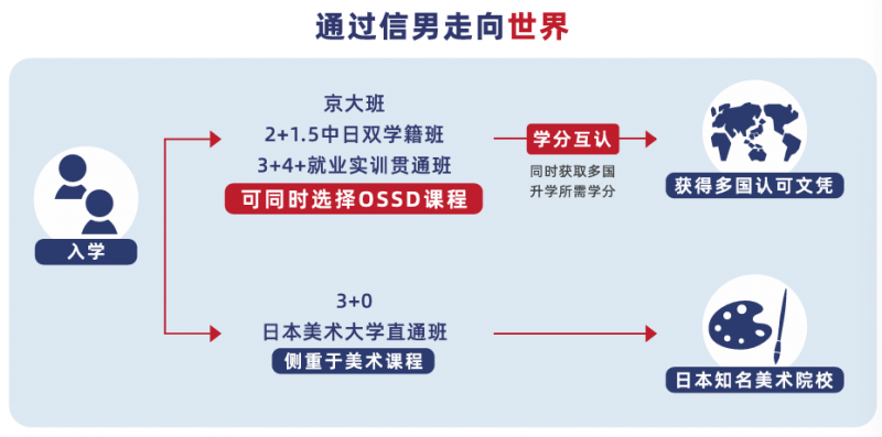 信男教育学园首创的“2+1.5双学籍”模式,让学生在国内完成两年高中学习后,赴日本姐妹校高中继续一年半的学业,最终获得中日双文凭,实现无缝衔接、平稳过渡。在此基础上,信男进一步推出“3+4双学籍”国际中本贯通模式,学生可申请日本国公立大学或加拿大前50的高校,升学路径更加多元。