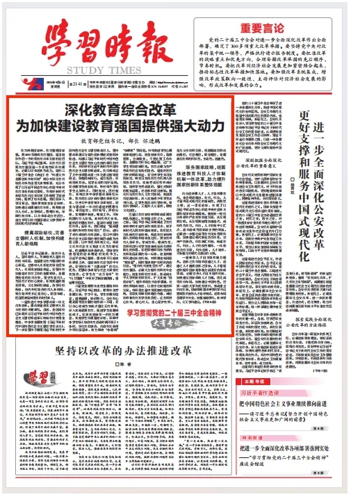 全面深化教育改革,加快建设教育强国,使命光荣、责任重大。教育系统将更加紧密地团结在以习近平同志为核心的党中央周围,坚持以习近平新时代中国特色社会主义思想为指导,认真学习贯彻党的二十大和二十届二中、三中全会精神,深刻领悟“两个确立”的决定性意义,增强“四个意识”、坚定“四个自信”、做到“两个维护”,当好贯彻党中央决策部署的执行者、行动派、实干家,为以中国式现代化全面推进强国建设、民族复兴伟业作出新的更大贡献。(本文刊发于《学习时报》2024年09月04日第A1版)